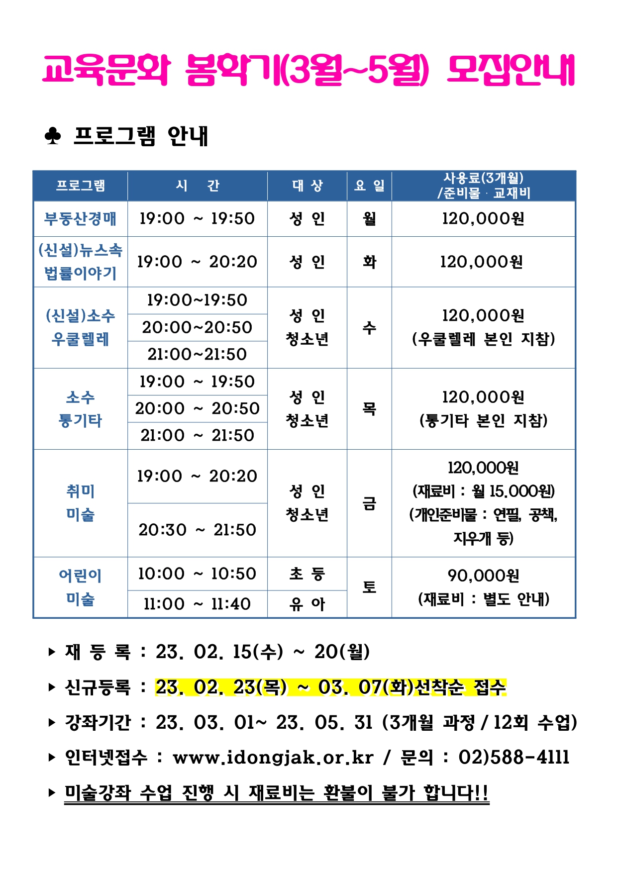 사당문화회관 사당문화회관 교육문화 봄학기(3월~5월)프로그램 안내 작성자 사당문화회관 작성일 2023년 2월 7일 9시 21분 13초 조회 904 2023 봄학기 홍보물(a0)최종_pages-to-jpg-0001.jpg [ Size : 643.98KB , Down : 368 ] 미리보기 다운로드 목록보기