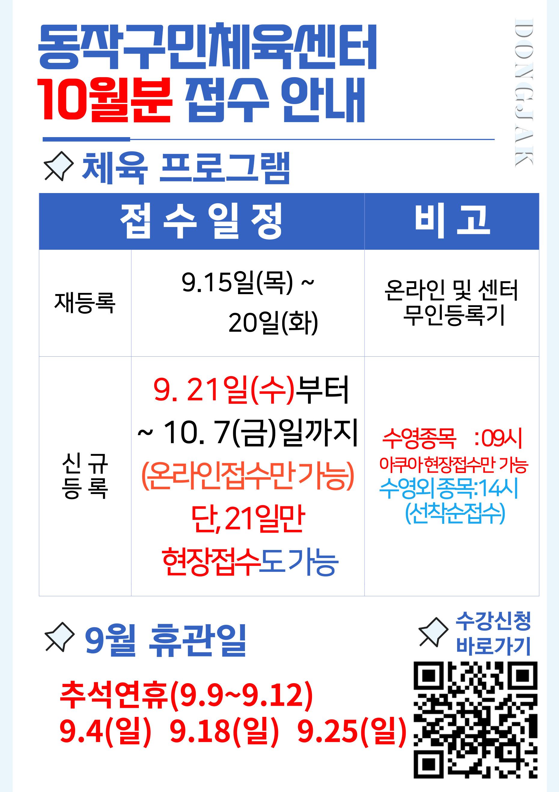 동작구민체육센터 동작구민체육센터 10월분 접수일정 안내 작성자 사당문화회관 작성일 2022년 9월 7일 14시 12분 38초 조회 982 10월분 접수 일정 .jpg [ Size : 658.23KB , Down : 271 ] 미리보기 다운로드 목록보기