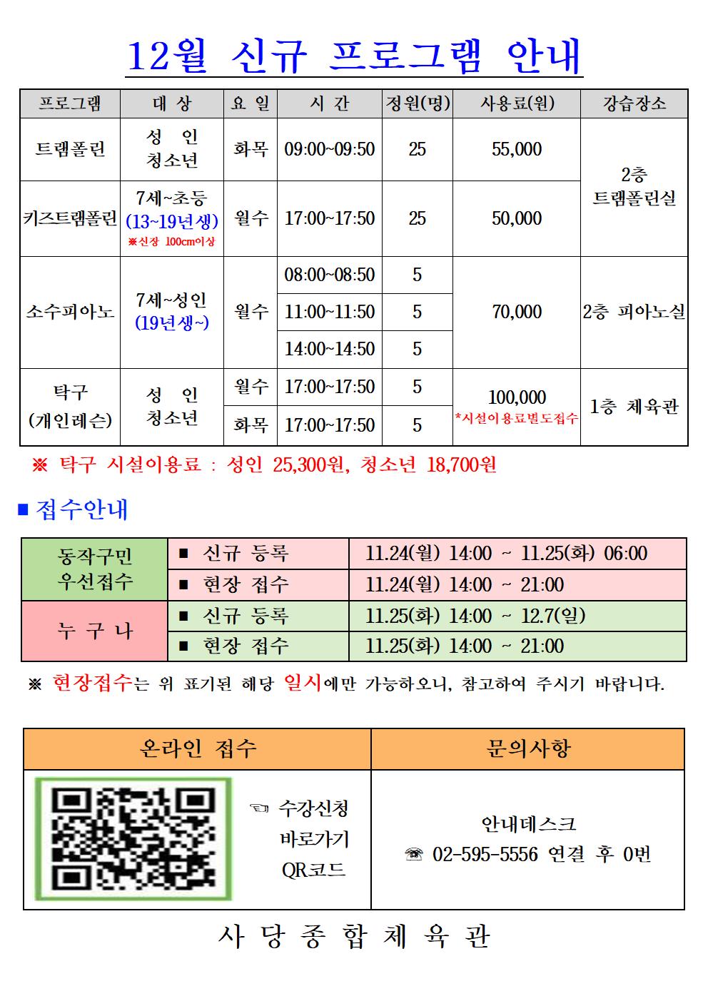 사당종합체육관 사당종합체육관 12월 신규프로그램 안내 및 회원모집 작성자 동작구민체육센터 작성일 2025년 11월 18일 11시 19분 0초 조회 419 12월 신규 프로그램(초안)001.jpg [ Size : 187.2KB , Down : 242 ] 미리보기 다운로드 목록보기