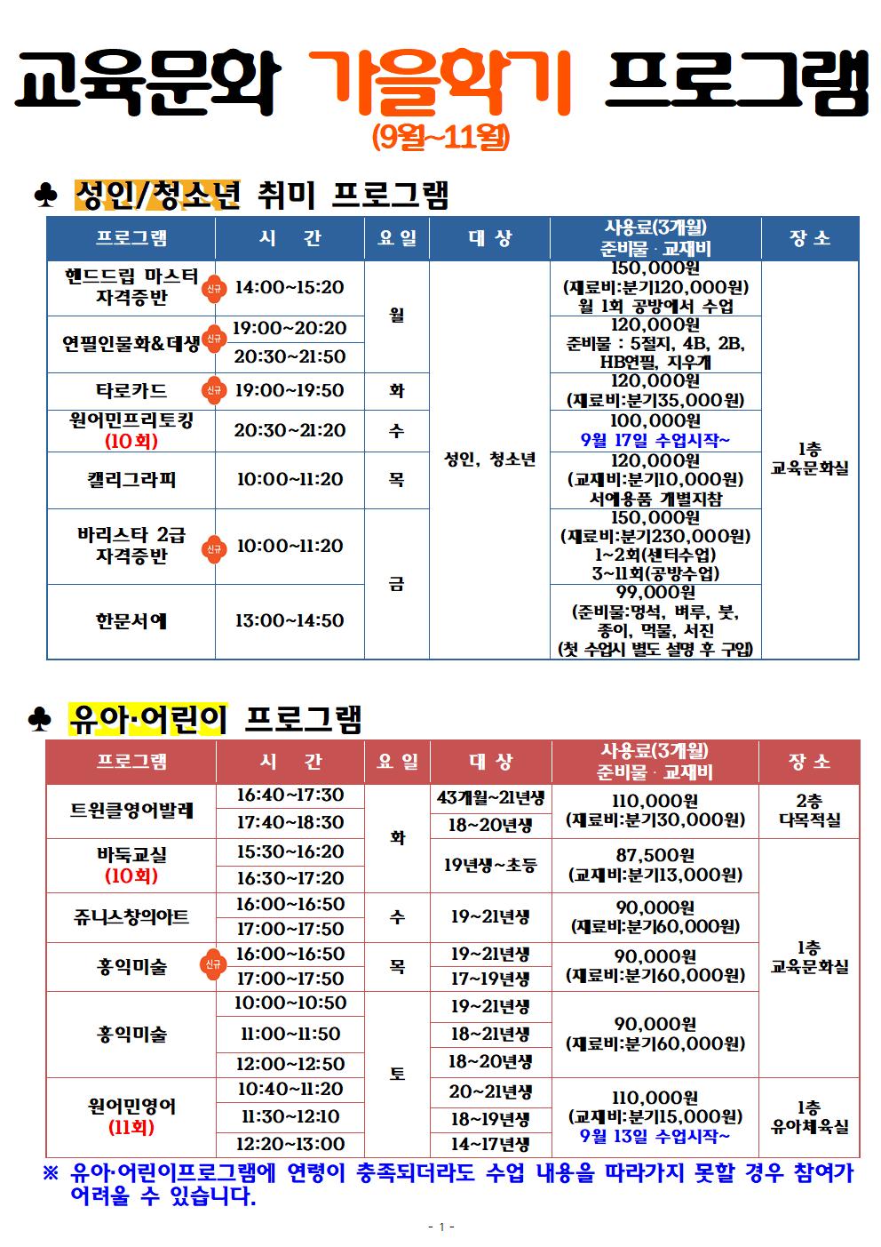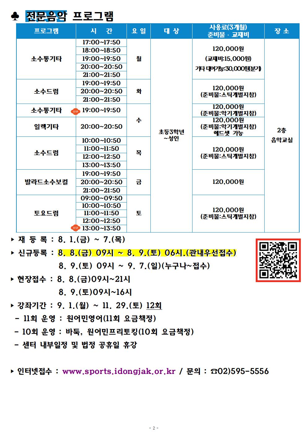 사당종합체육관 사당종합체육관 교육문화 가을학기(9월~11월)프로그램 안내 작성자 동작구민체육센터 작성일 2025년 7월 30일 15시 25분 58초 조회 684 2025년 가을학기 홍보물001.jpg [ Size : 251.46KB , Down : 391 ] 미리보기 다운로드 2025년 가을학기 홍보물002.jpg [ Size : 191.8KB , Down : 376 ] 미리보기 다운로드 목록보기
