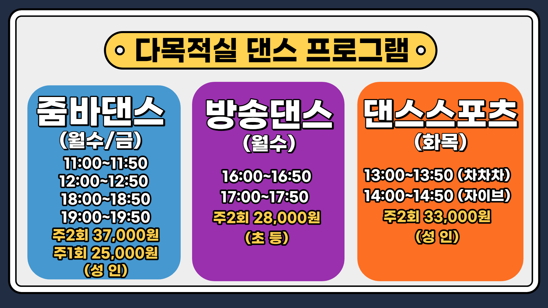 흑석체육센터 흑석체육센터 7월 신규 댄스강좌 안내 작성자 흑석체육문화센터 작성일 2022년 6월 20일 16시 40분 47초 조회 1,067 댄스강좌 홍보물.jpg [ Size : 878.59KB , Down : 726 ] 미리보기 다운로드 목록보기