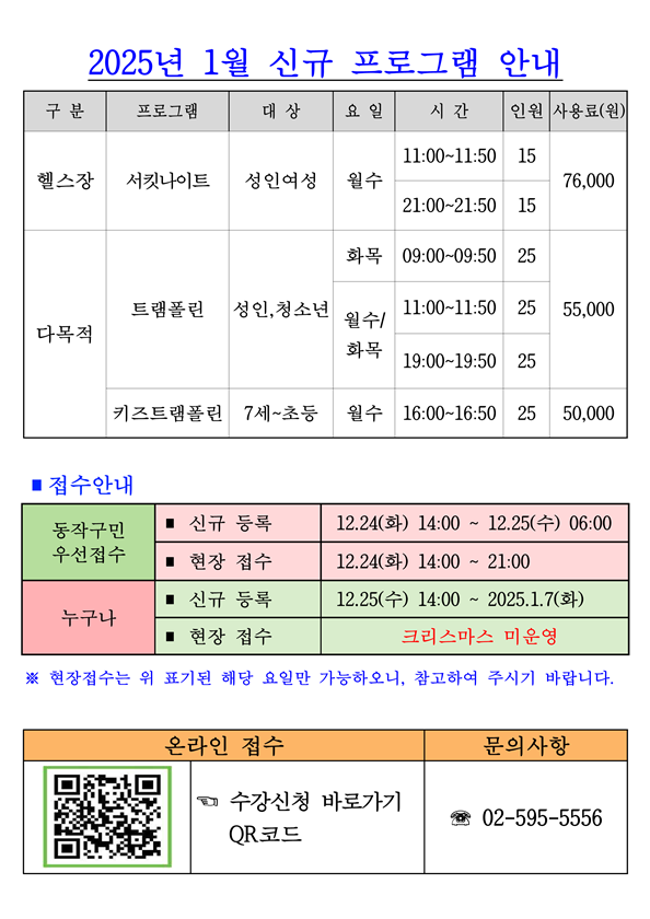 사당종합체육관 사당종합체육관 2025년 1월 신규프로그램 회원모집 작성자 동작구민체육센터 작성일 2024년 12월 17일 18시 45분 14초 조회 587 25년 1월 신규 프로그램(수정)_1.png [ Size : 125.29KB , Down : 344 ] 미리보기 다운로드 목록보기