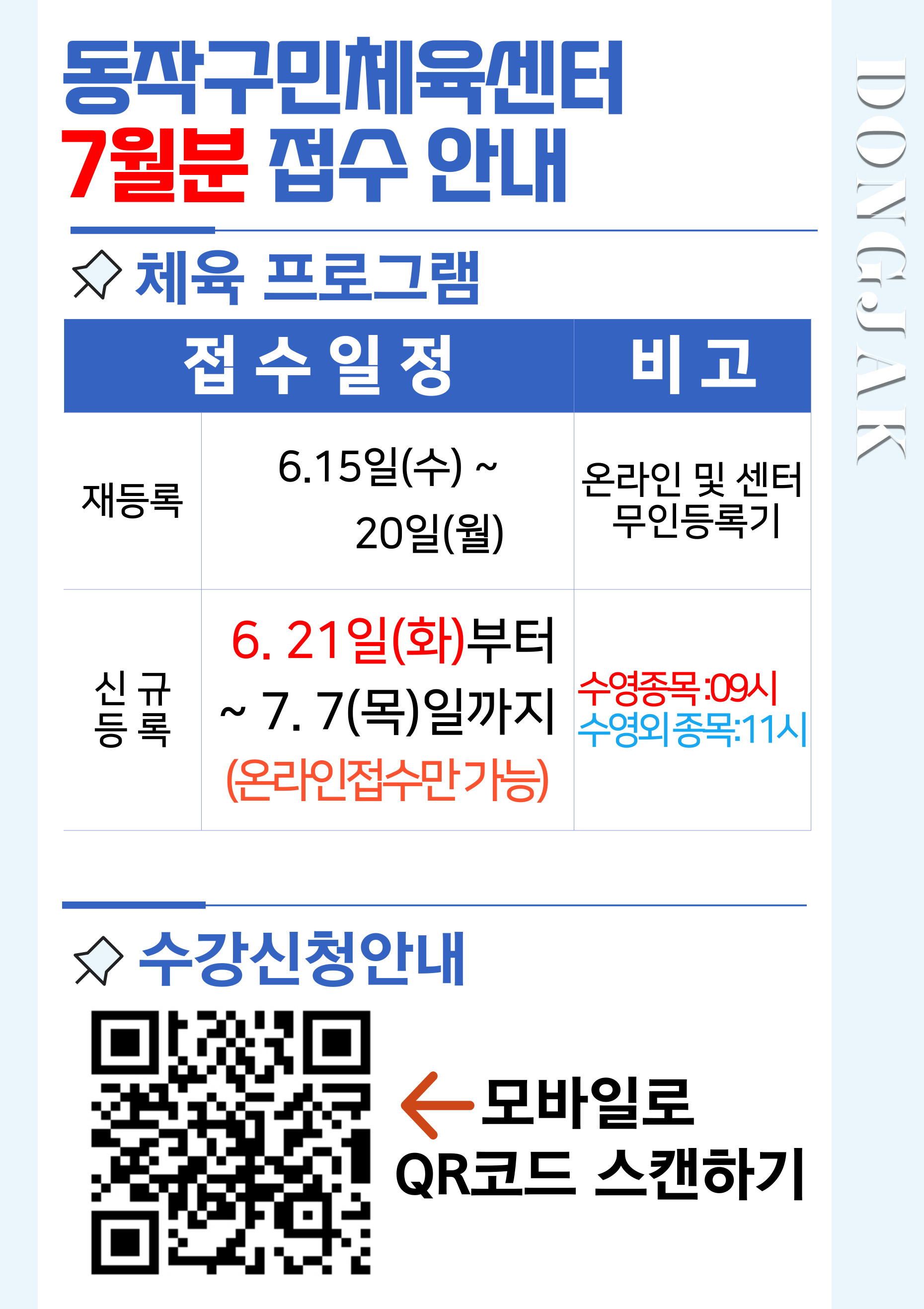동작구민체육센터 동작구민체육센터 7월 접수 일정 안내 작성자 사당문화회관 작성일 2022년 6월 8일 9시 34분 30초 조회 1,070 7월-접수-안내.jpg [ Size : 500.1KB , Down : 350 ] 미리보기 다운로드 목록보기