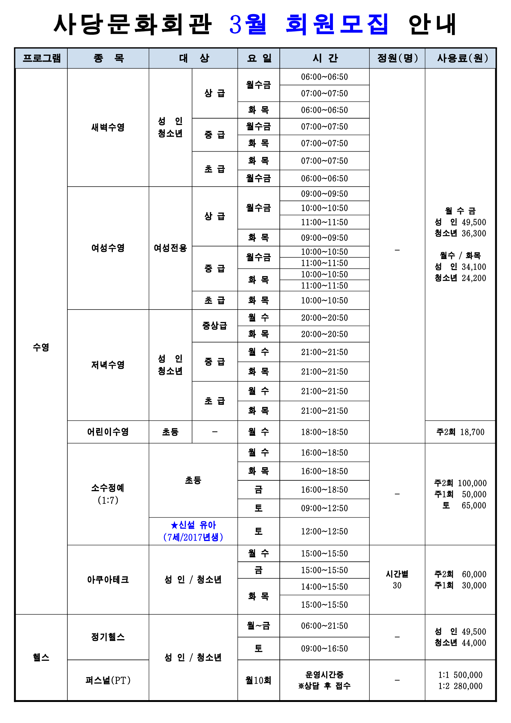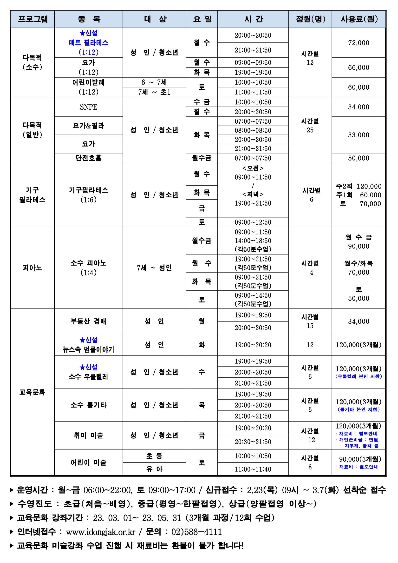 사당문화회관 사당문화회관 3월 프로그램 및 회원모집 안내 작성자 동작구민체육센터 작성일 2023년 2월 20일 16시 18분 39초 조회 891 25b0d7262376414688f9a882e0b3dd6fnxt1qd8ryZ6AHpSg-0.jpg [ Size : 609.24KB , Down : 396 ] 미리보기 다운로드 25b0d7262376414688f9a882e0b3dd6fnxt1qd8ryZ6AHpSg-1.jpg [ Size : 820.03KB , Down : 426 ] 미리보기 다운로드 목록보기