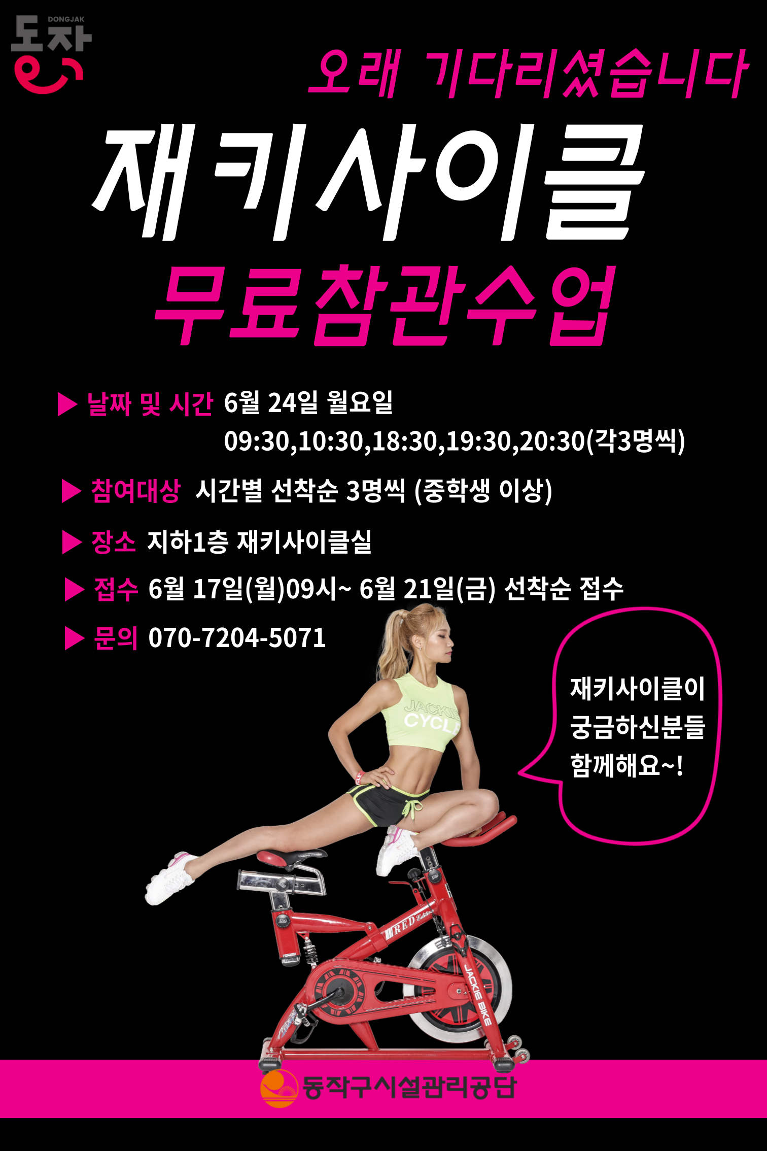 동작구시설관리공단 동작구민체육센터 재키사이클 무료참관수업 안내 작성자 사당문화회관 작성일 2024년 6월 18일 5시 56분 52초 조회 742 2024 재키사이클 무료참관수업 홍보물.png [ Size : 745.23KB , Down : 395 ] 미리보기 다운로드 목록보기