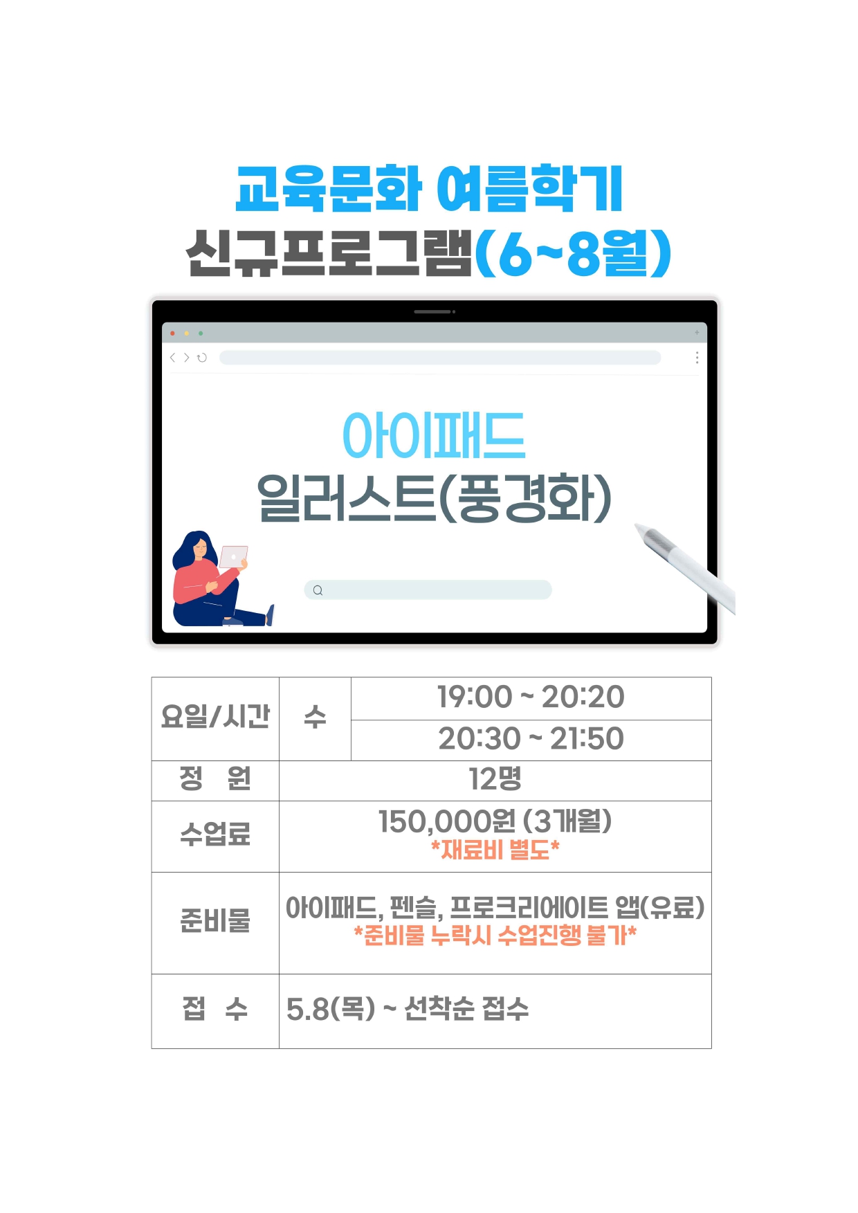 사당문화회관 사당문화회관 교육문화 여름학기(6~8월) 신설 프로그램 [아이패드 일러스트] 회원모집 안내 작성자 동작구민체육센터 작성일 2025년 5월 7일 7시 22분 28초 조회 632 아이패드 일러스트 (2).jpg [ Size : 332.57KB , Down : 359 ] 미리보기 다운로드 목록보기