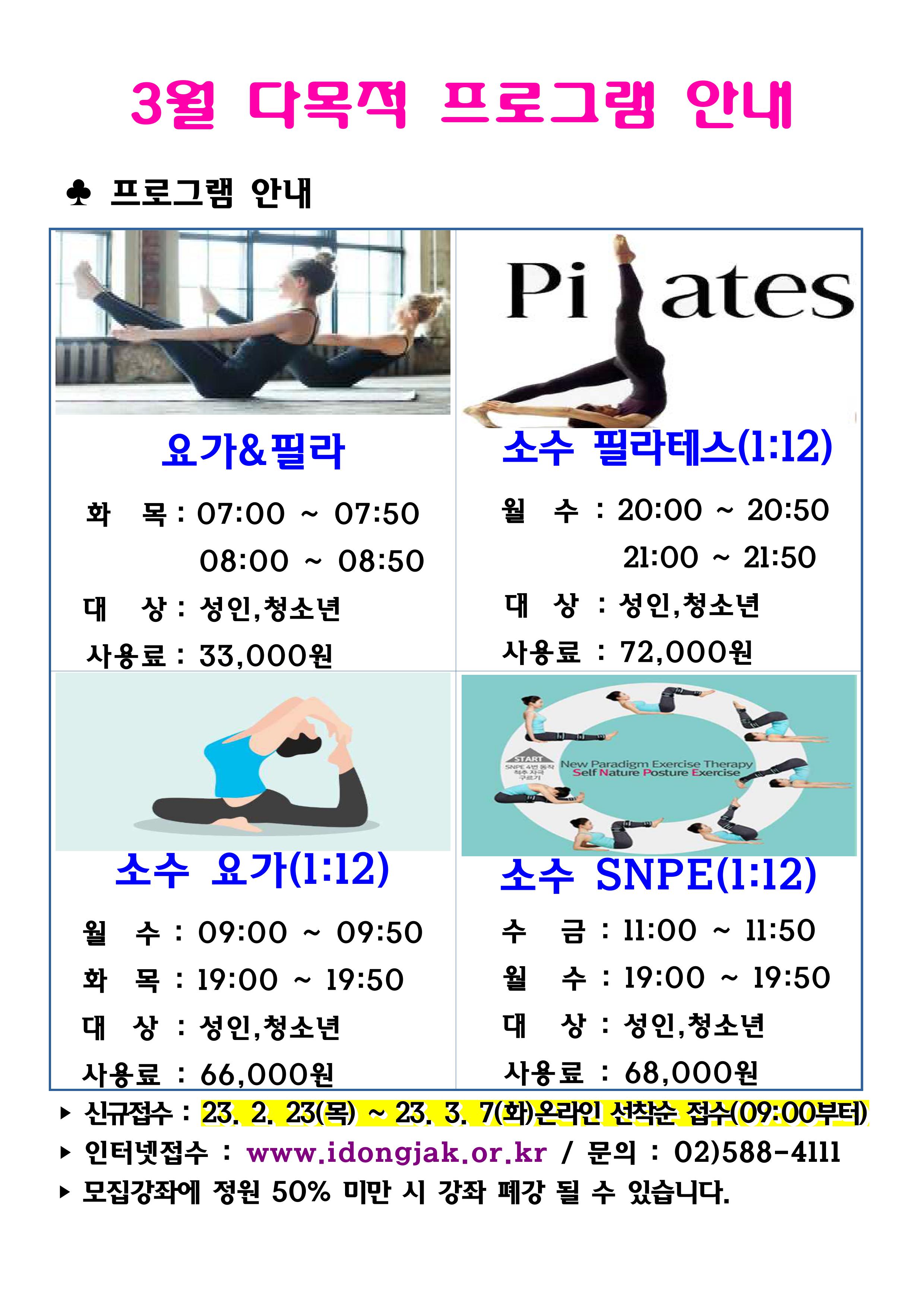 사당문화회관 사당문화회관 3월 다목적 프로그램 회원모집 안내 작성자 동작구민체육센터 작성일 2023년 2월 6일 15시 55분 58초 조회 846 3월 체육신규프로그램홍보.jpg [ Size : 642.9KB , Down : 685 ] 미리보기 다운로드 목록보기