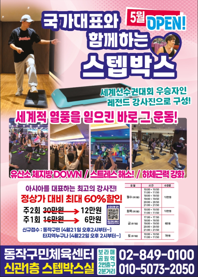 동작구민체육센터 동작구민체육센터 스텝에어로(스텝박스)/스프링보드 신규개설 작성자 동작구민체육센터 작성일 2026년 4월 15일 18시 41분 28초 조회 46 스텝박스.jpg [ Size : 543.79KB , Down : 45 ] 미리보기 다운로드 스프링보드.jpg [ Size : 508.12KB , Down : 40 ] 미리보기 다운로드 목록보기