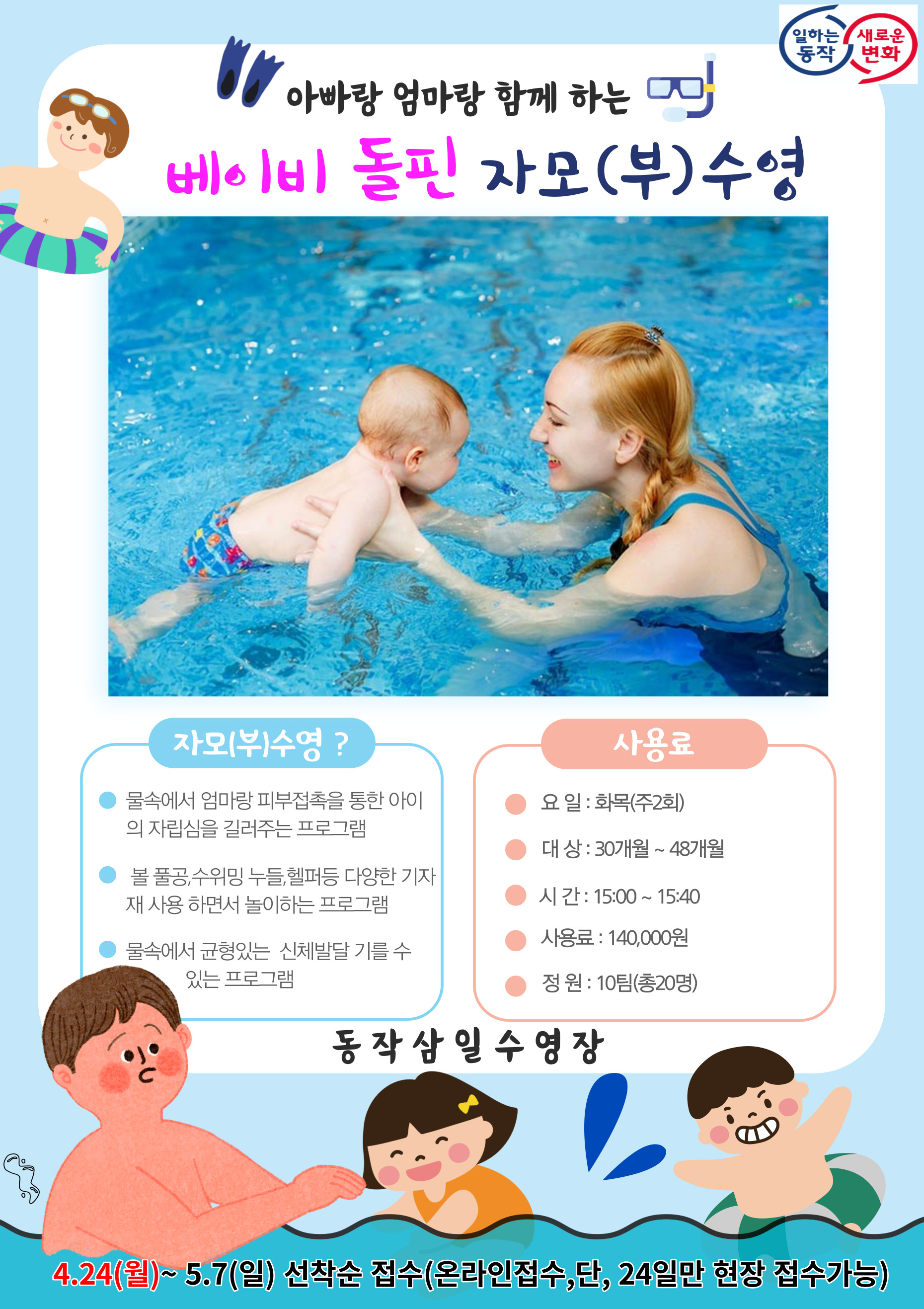 삼일수영장 동작삼일수영장 특화프로그램 베이비 돌핀 자모(부) 수영 회원모집안내 !!! 작성자 사당문화회관 작성일 2023년 4월 14일 10시 34분 43초 조회 856 베이비 돌핀 자모(부) 홍보뭏.jpg [ Size : 933.88KB , Down : 522 ] 미리보기 다운로드 목록보기