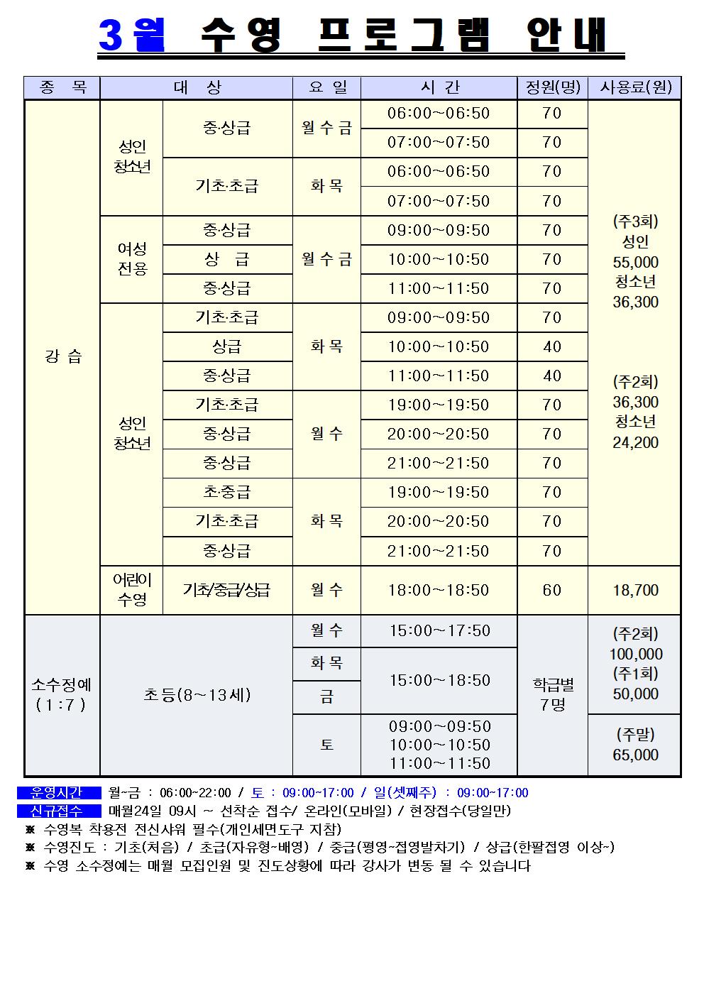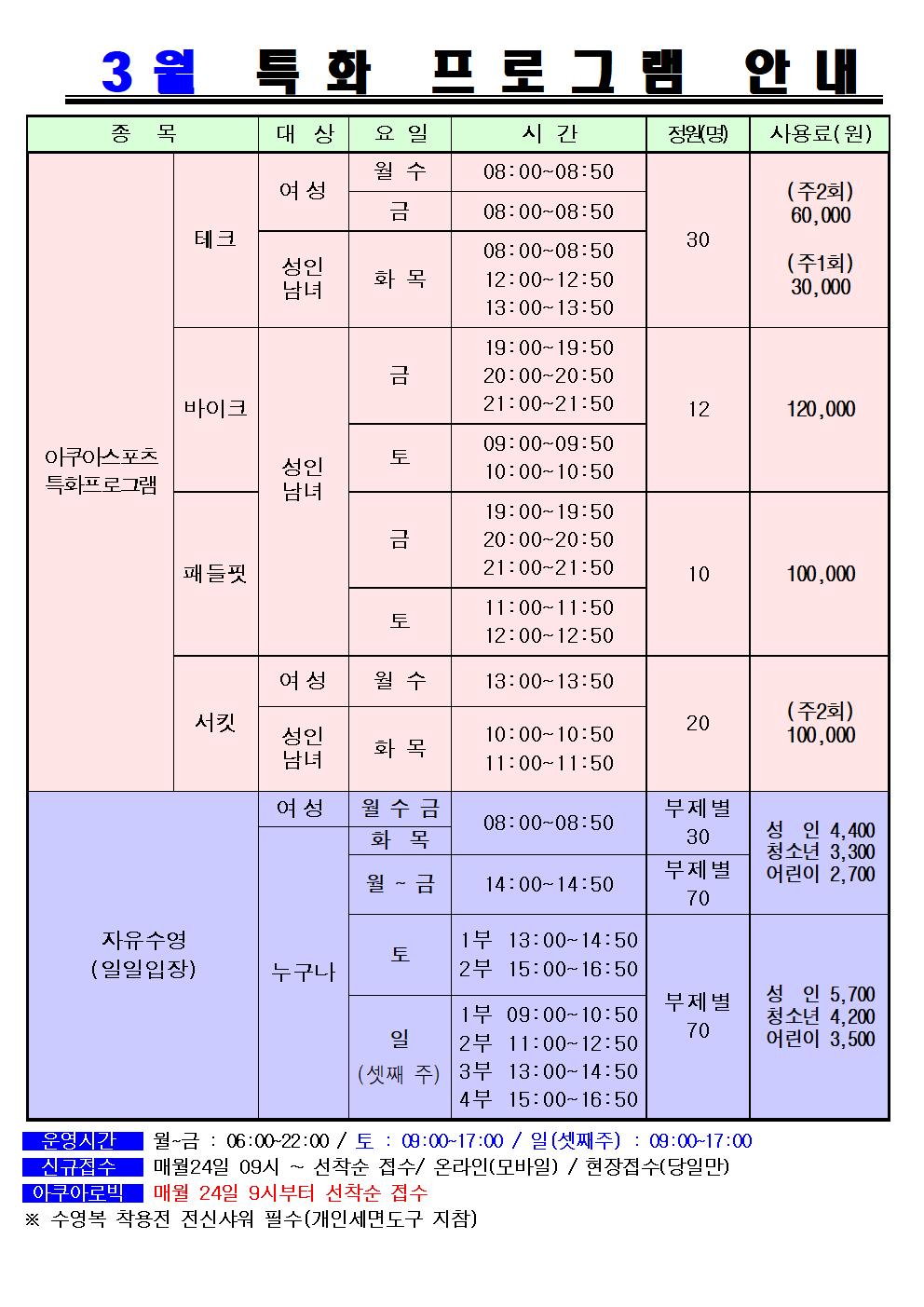 삼일수영장 동작삼일수영장 3월 프로그램 및 회원모집 안내 작성자 동작구민체육센터 작성일 2023년 2월 23일 20시 8분 5초 조회 971 3월 프로그램 안내 (삼일) 인터넷001.jpg [ Size : 197.87KB , Down : 385 ] 미리보기 다운로드 3월 프로그램 안내 (삼일) 인터넷002.jpg [ Size : 185.49KB , Down : 410 ] 미리보기 다운로드 목록보기