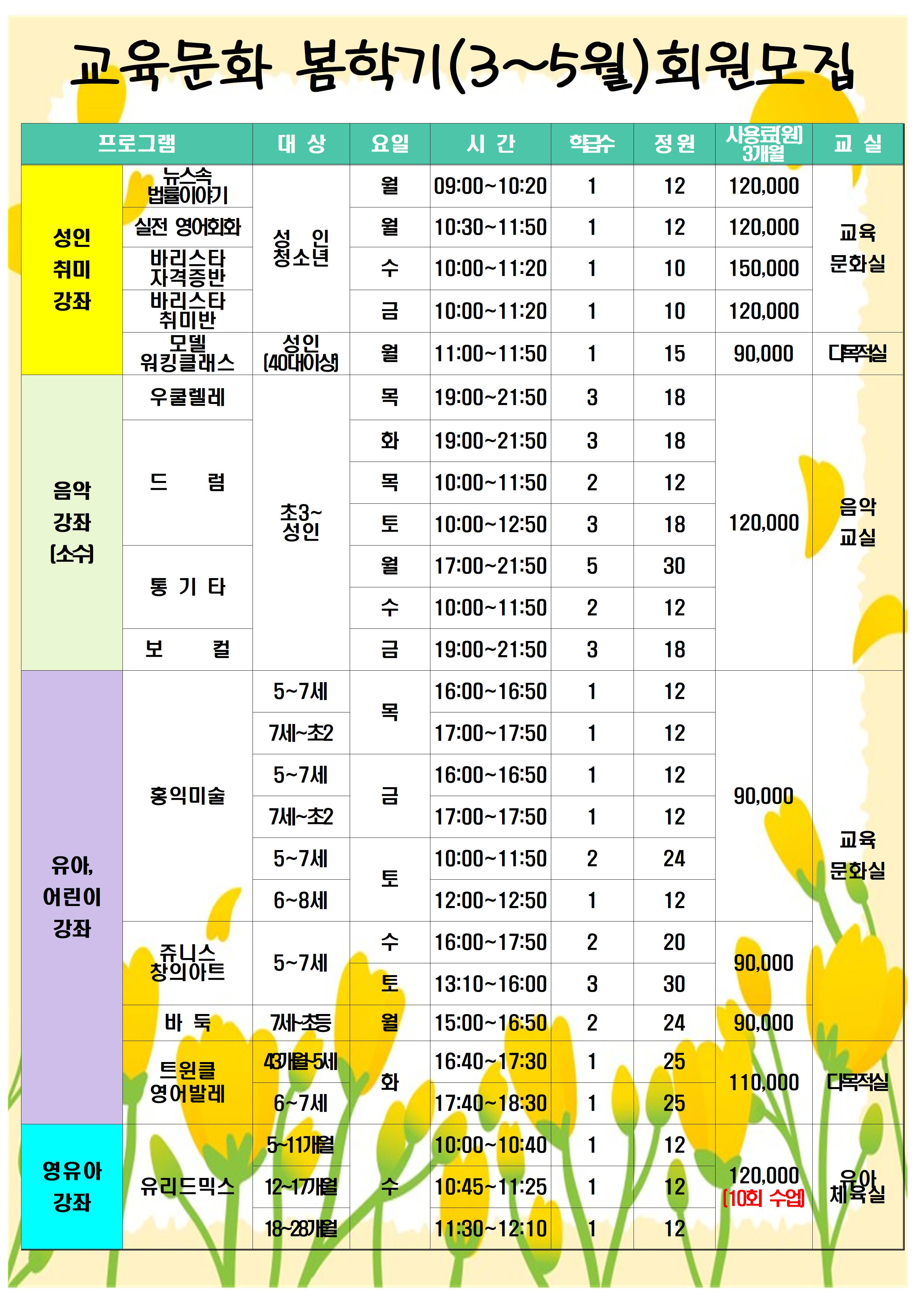 사당종합체육관 사당종합 체육관 봄학기(3~5월) 교육문화 프로그램 안내 작성자 동작구민체육센터 작성일 2023년 1월 30일 14시 26분 23초 조회 911 봄학기 교육문화(사종체)001.jpg [ Size : 947.02KB , Down : 288 ] 미리보기 다운로드 목록보기