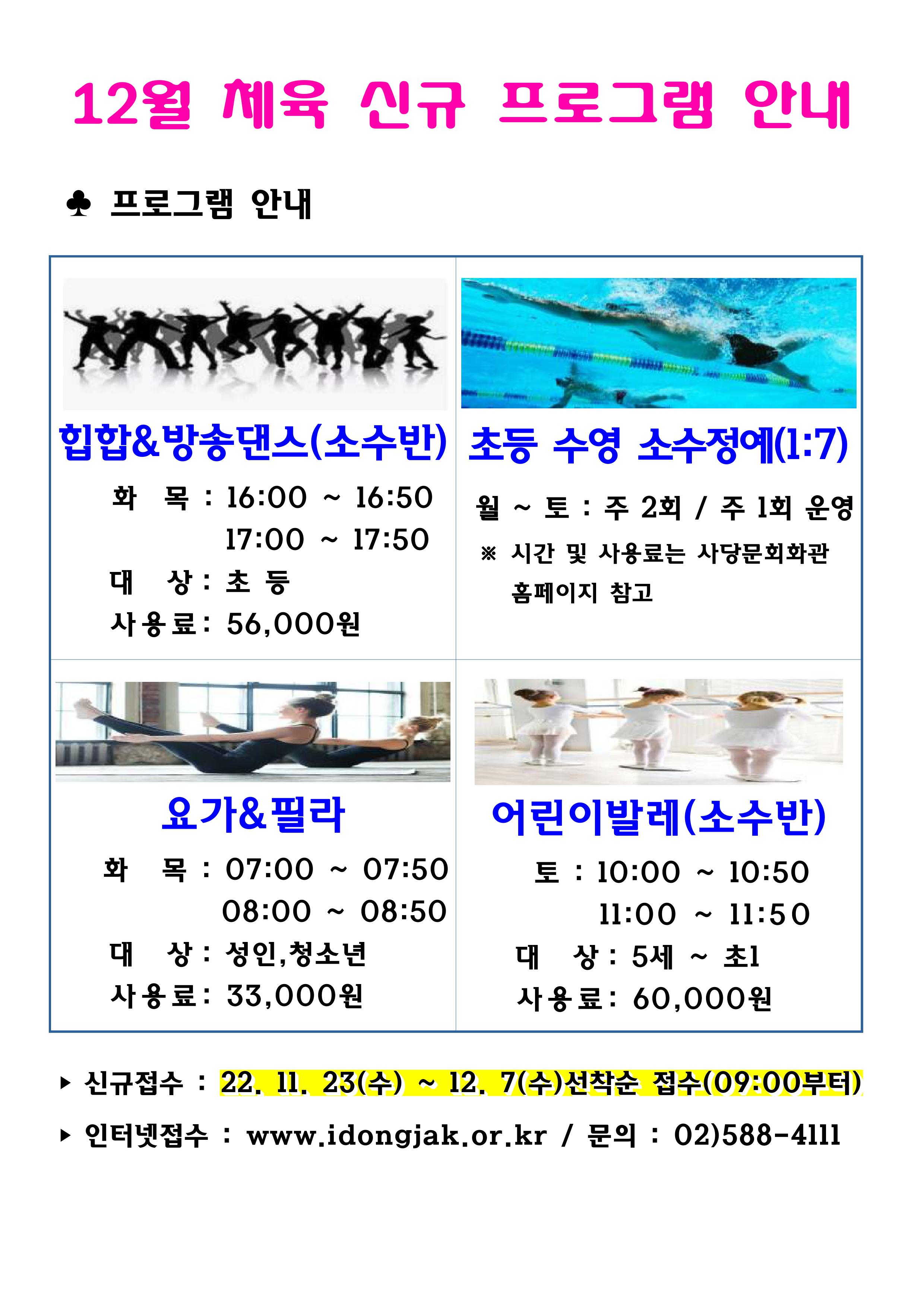 사당문화회관 사당문화회관 12월 체육 신규프로그램 회원모집 안내 작성자 동작구민체육센터 작성일 2022년 11월 21일 16시 36분 1초 조회 884 12월 체육프로그램.jpg [ Size : 633.56KB , Down : 923 ] 미리보기 다운로드 목록보기