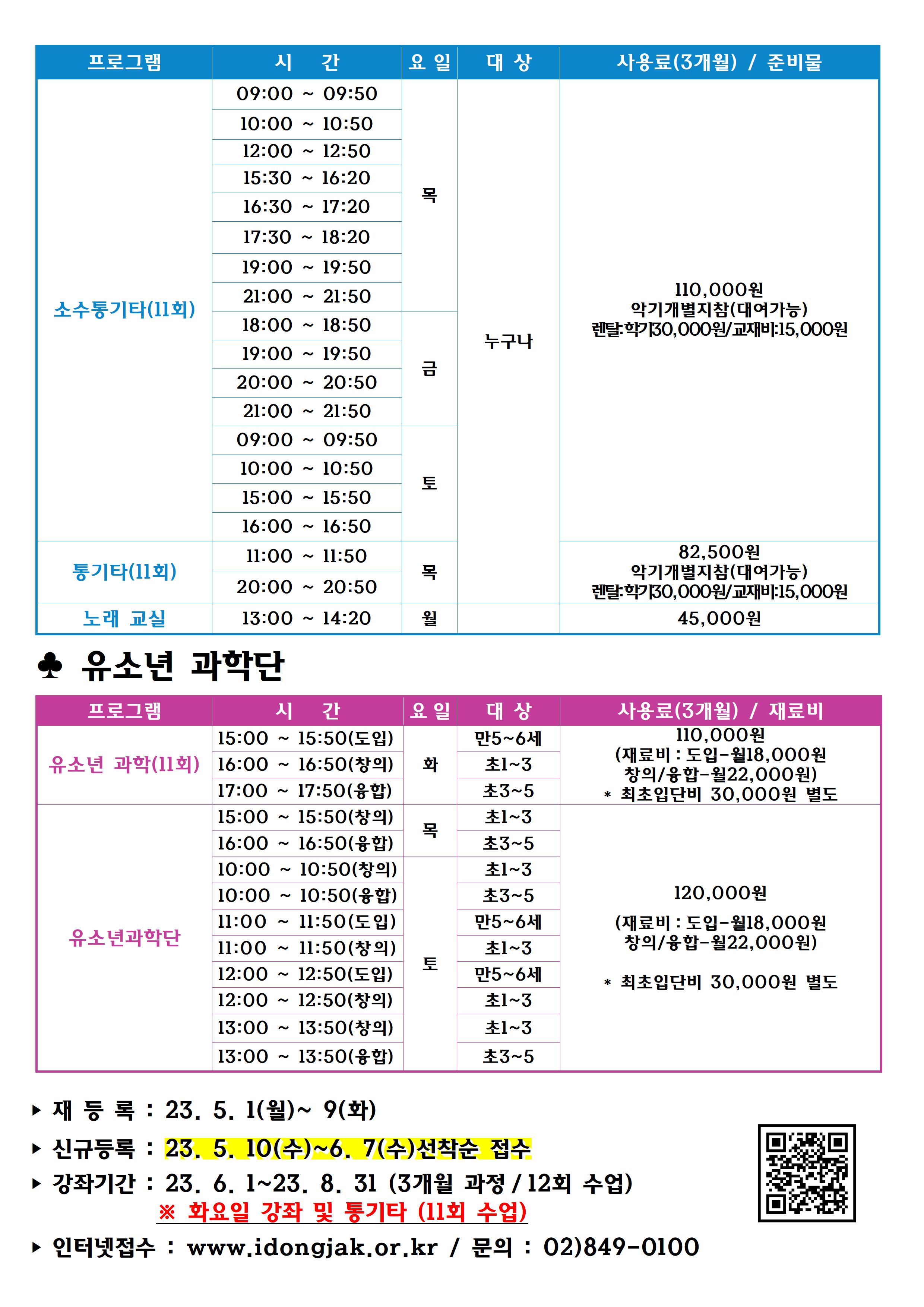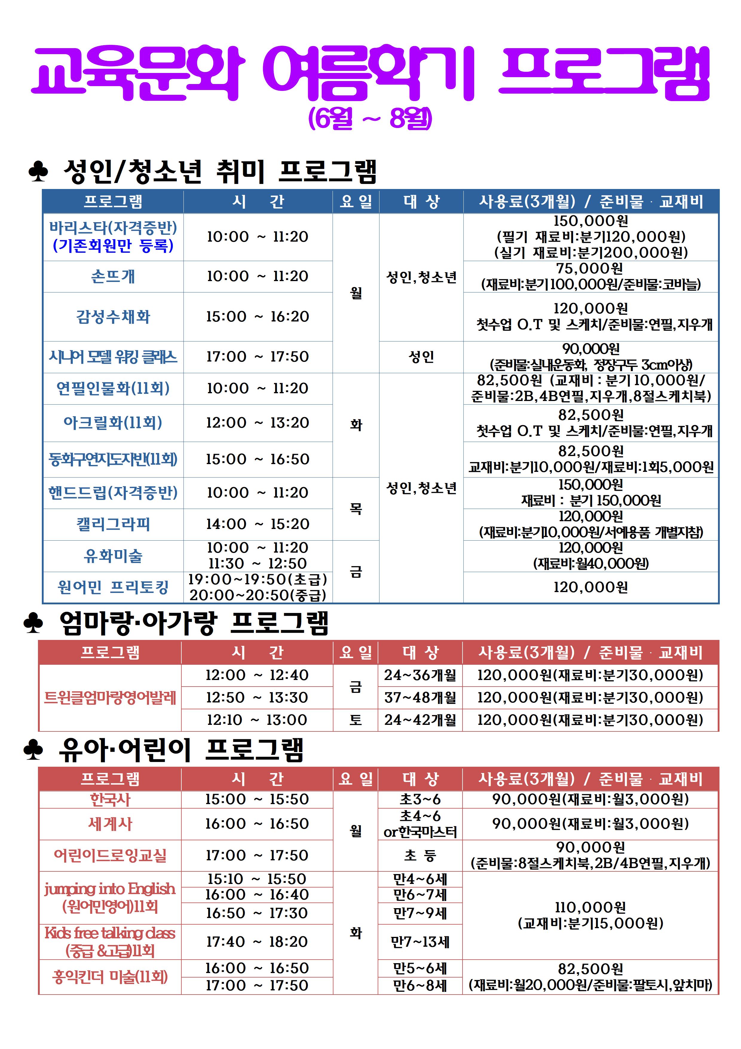 동작구민체육센터 동작구민체육센터 교육문화 여름학기(6~8월)회원모집 안내 작성자 사당문화회관 작성일 2023년 4월 25일 18시 30분 4초 조회 862 2023 여름학기 홍보물(a0)최종 23.4001.jpg [ Size : 981.43KB , Down : 254 ] 미리보기 다운로드 2023 여름학기 홍보물(a0)최종 23.4002.jpg [ Size : 976.44KB , Down : 235 ] 미리보기 다운로드 2023 여름학기 홍보물(a0)최종 23.4003.jpg [ Size : 742.91KB , Down : 205 ] 미리보기 다운로드 목록보기