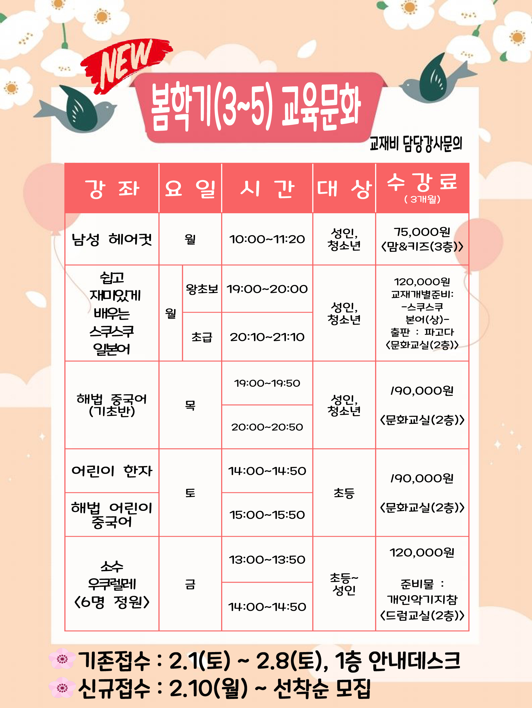 사당문화회관 사당문화회관 봄학기(3~5월) 교육문화 신규 프로그램 안내 작성자 사당문화회관 작성일 2020년 2월 5일 10시 52분 22초 조회 1,437 봄학기 신설A1-5.jpg [ Size : 1.27MB , Down : 836 ] 미리보기 다운로드 목록보기
