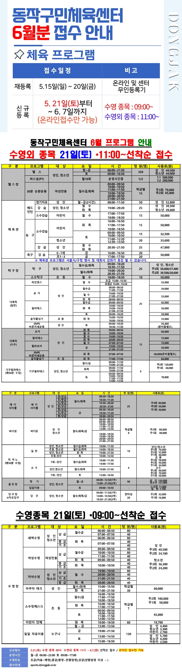 동작구민체육센터 동작구민체육센터 6월 접수일정 및 프로그램 안내 작성자 사당문화회관 작성일 2022년 5월 20일 14시 13분 36초 조회 1,109 최 종 오오오오오오오오오옹오.jpg [ Size : 715.51KB , Down : 690 ] 미리보기 다운로드 목록보기