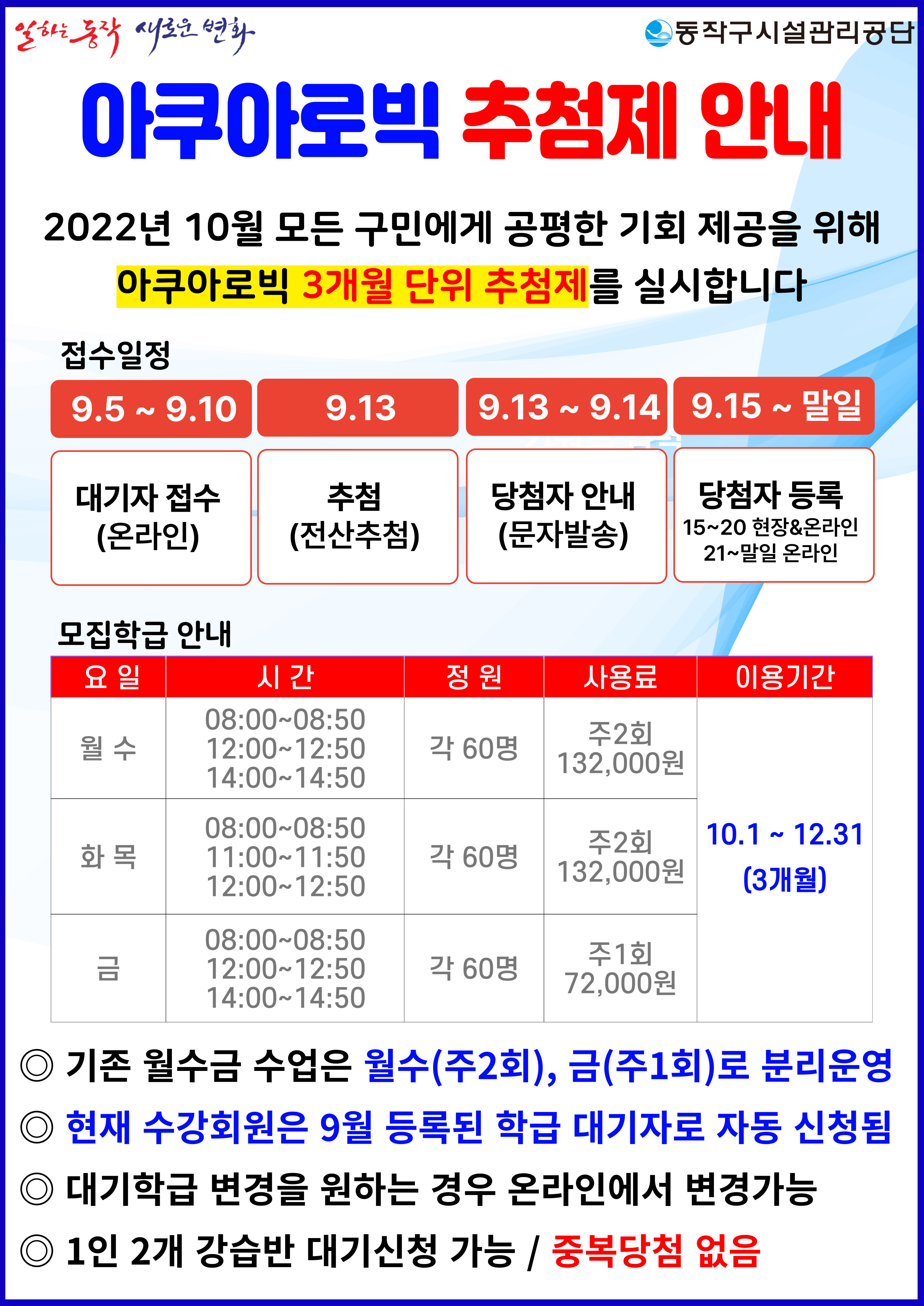 사당문화회관 사당문화회관 아쿠아로빅 추첨제 안내 작성자 사당문화회관 작성일 2022년 8월 29일 15시 41분 56초 조회 961 아쿠아로빅 추첨제 안내.jpg [ Size : 1.67MB , Down : 278 ] 미리보기 다운로드 목록보기