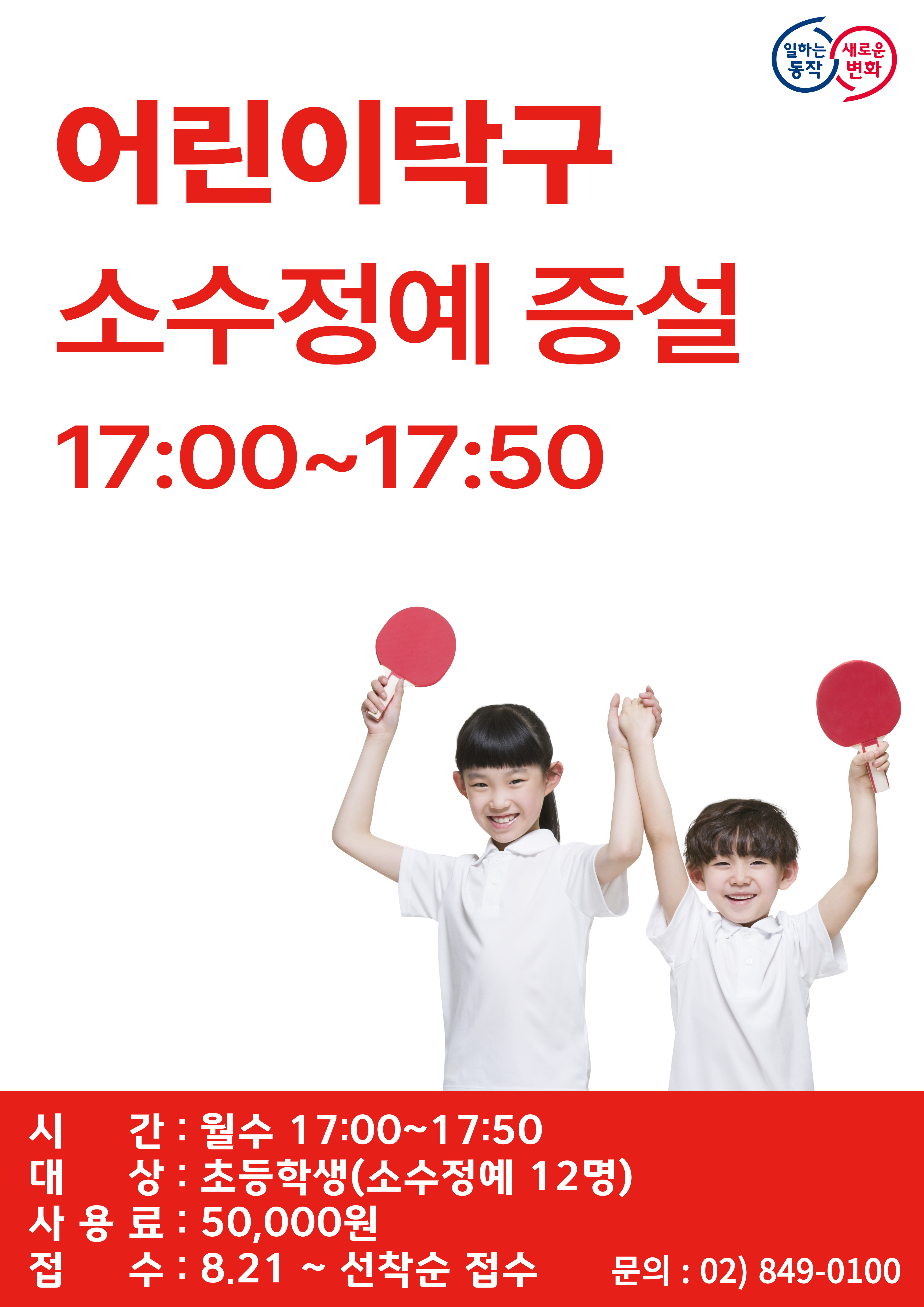 동작구민체육센터 동작구민체육센터 어린이 탁구소수 증설안내 작성자 사당문화회관 작성일 2023년 8월 18일 16시 5분 33초 조회 665 어린이탁구-001.jpg [ Size : 1.55MB , Down : 232 ] 미리보기 다운로드 목록보기