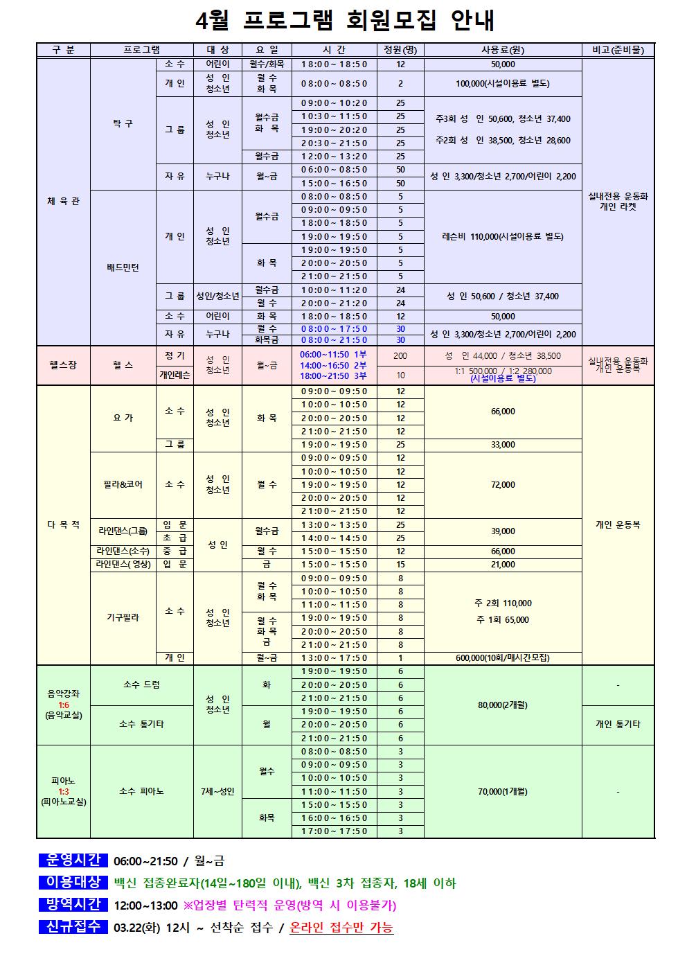 사당종합체육관 사당종합체육관 4월 프로그램 안내 작성자 동작구민체육센터 작성일 2022년 3월 16일 18시 2분 56초 조회 1,010 사당종합체육관 2022년 4월 프로그램 회원모집 안내(최최최종)001.jpg [ Size : 222.71KB , Down : 378 ] 미리보기 다운로드 목록보기