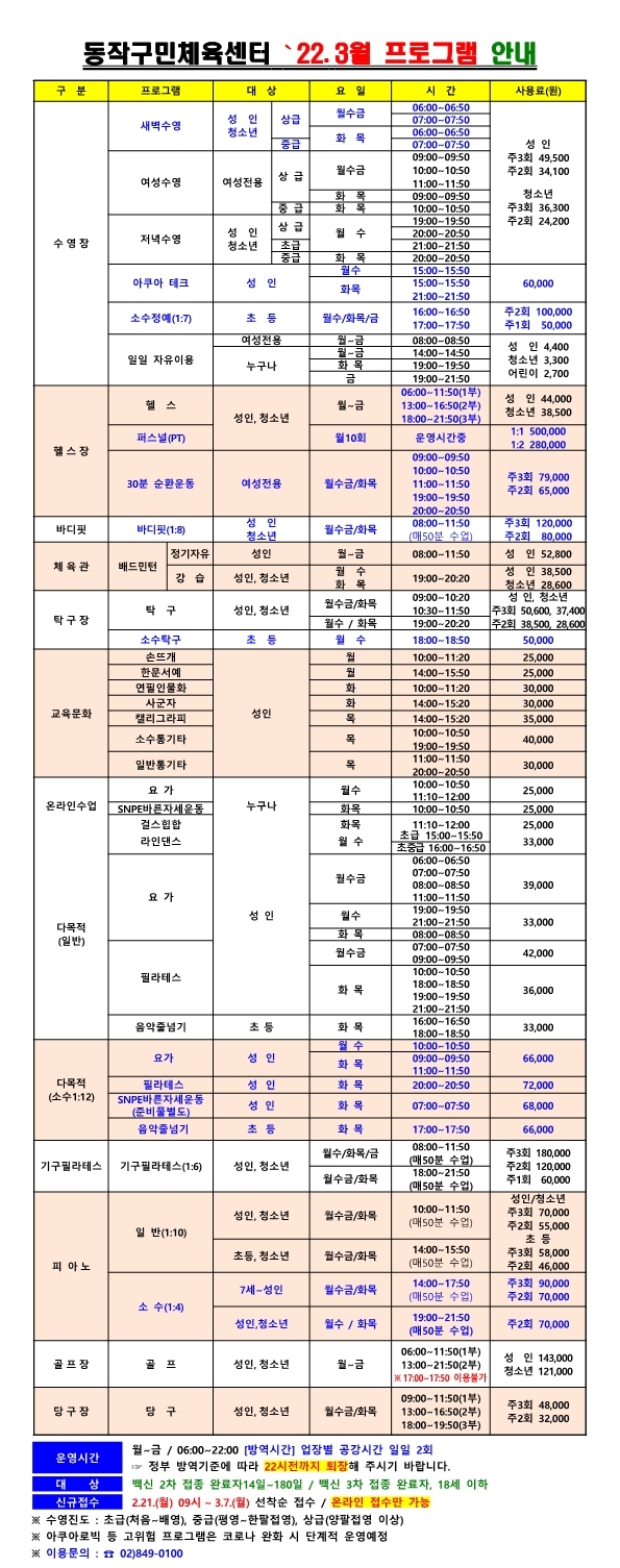 동작구민체육센터 동작구민체육센터 3월 프로그램 안내 작성자 사당문화회관 작성일 2022년 2월 16일 14시 22분 4초 조회 1,087 최도오오오옹오.jpg [ Size : 563.41KB , Down : 574 ] 미리보기 다운로드 목록보기