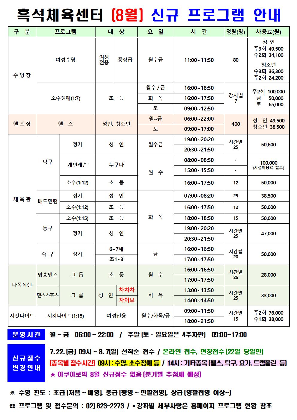 흑석체육센터 흑석체육센터 (8월) 신규프로그램 안내 작성자 흑석체육문화센터 작성일 2022년 7월 15일 17시 22분 39초 조회 1,050 8월 프로그램 안내(흑석)신규001.jpg [ Size : 225.07KB , Down : 570 ] 미리보기 다운로드 목록보기