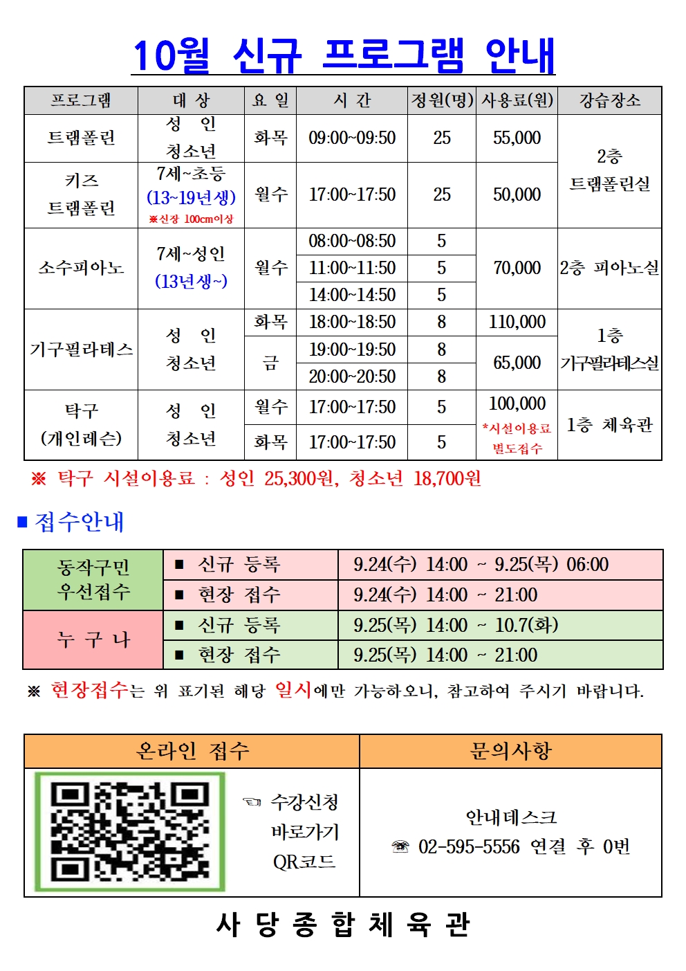 사당종합체육관 사당종합체육관 10월 신규프로그램 안내 작성자 동작구민체육센터 작성일 2025년 9월 25일 14시 32분 27초 조회 462 10월 신규 프로그램(수정)001.jpg [ Size : 629.72KB , Down : 212 ] 미리보기 다운로드 목록보기