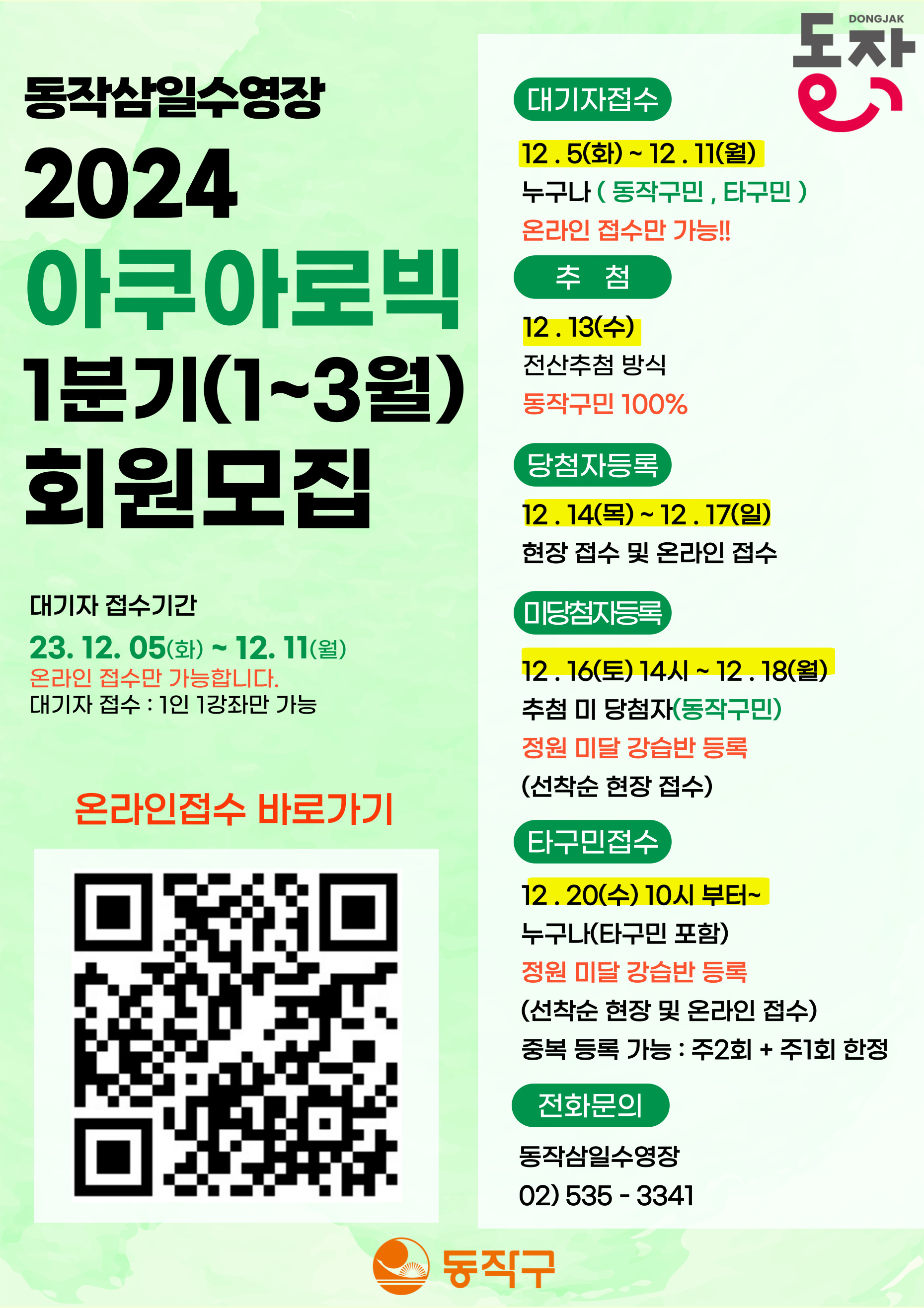삼일수영장 동작삼일수영장 2024년 1분기(1월~3월) 아쿠아로빅 접수일정 안내 작성자 사당문화회관 작성일 2023년 12월 1일 13시 21분 34초 조회 627 아쿠아로빅 수정 .jpg [ Size : 763.96KB , Down : 298 ] 미리보기 다운로드 목록보기