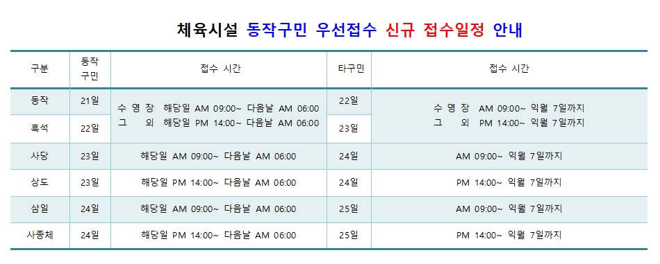 체육시설 동작구민 우선접수 신규 접수일정 안내